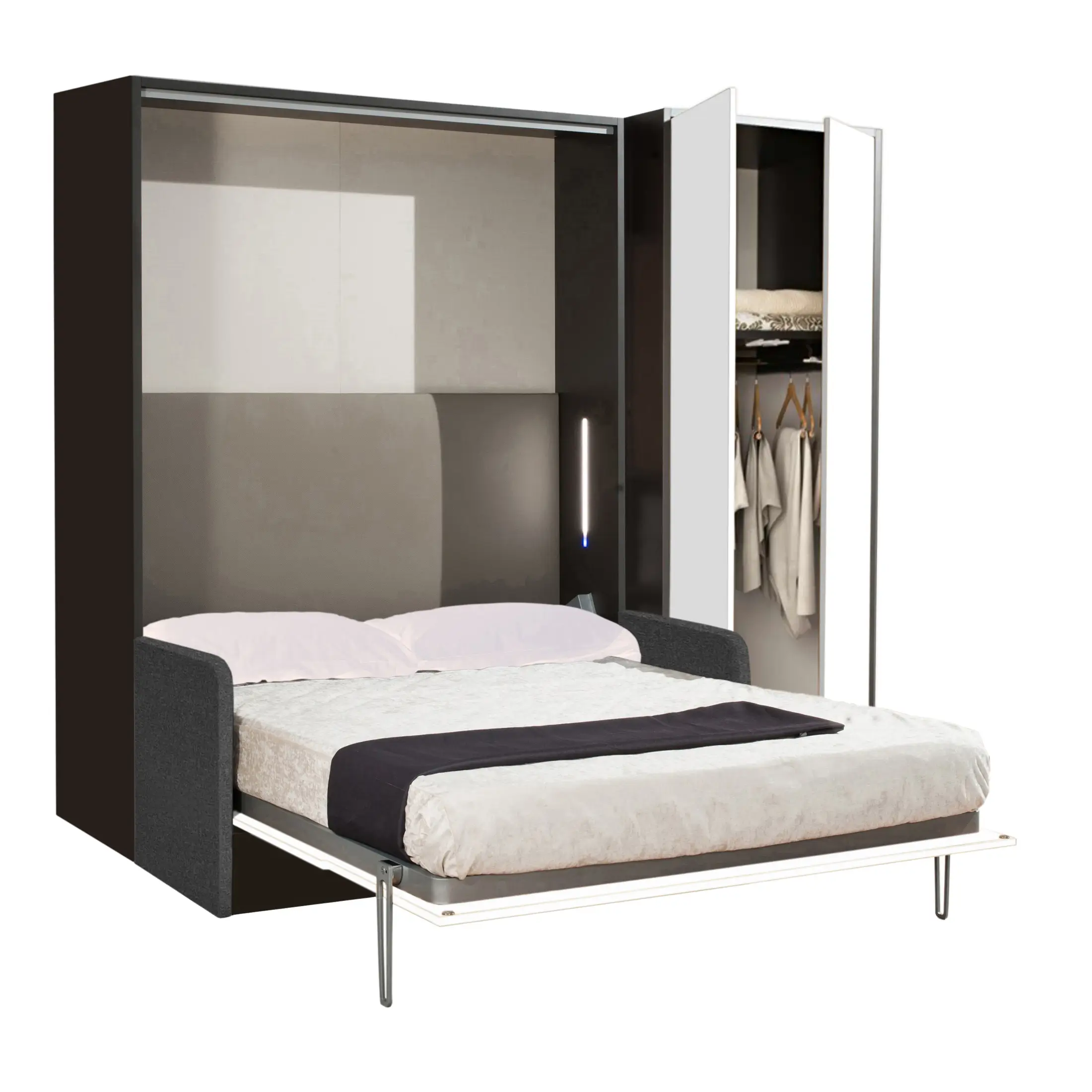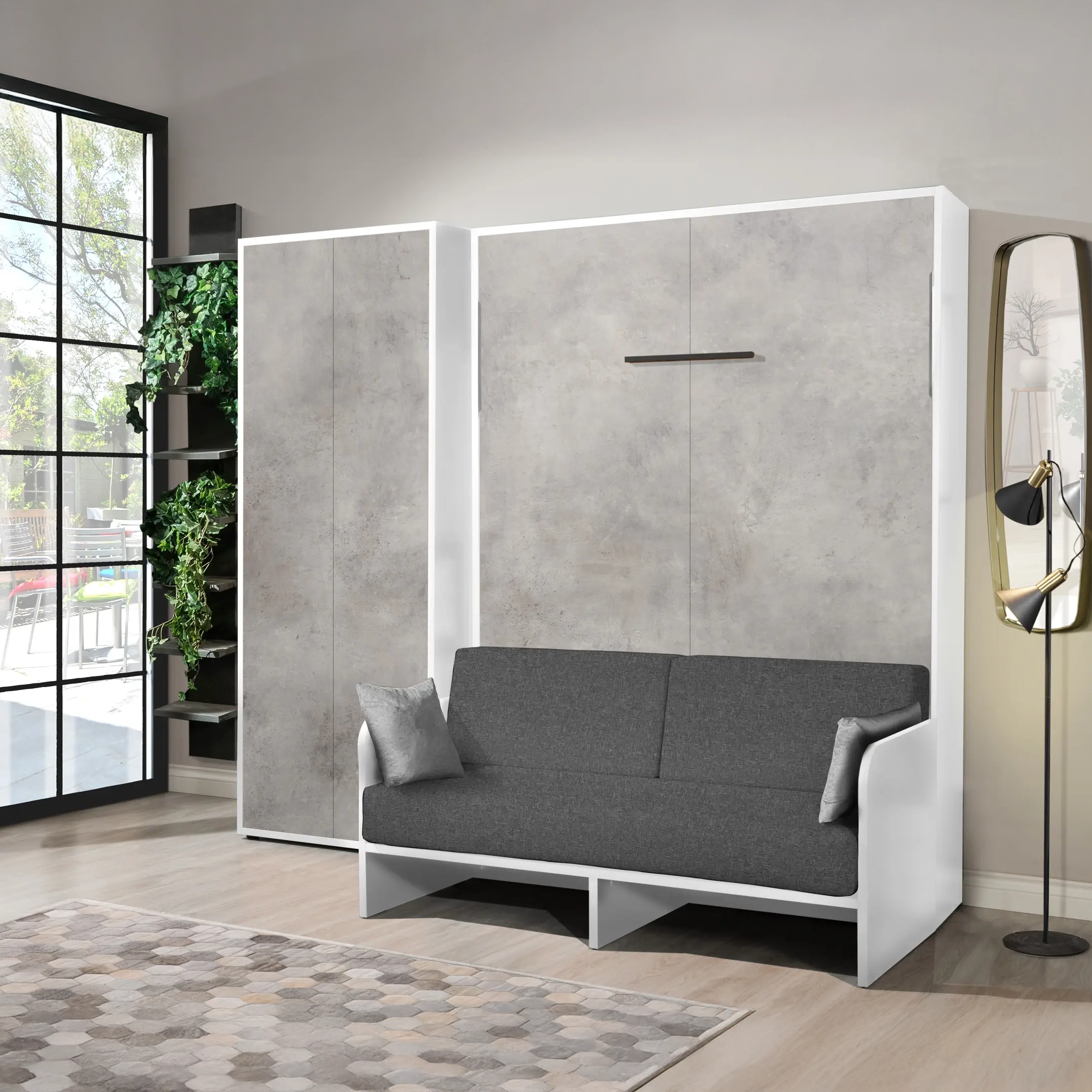 Il Letto a Scomparsa Verticale Matrimoniale con Divano – Set06M è una soluzione d’arredo intelligente che combina in un unico mobile un comodo letto matrimoniale, un divano integrato e un armadio alla francese. Perfetto per ottimizzare spazi ridotti senza rinunciare a comfort e stile, è ideale per monolocali, camere multifunzione o living moderni.